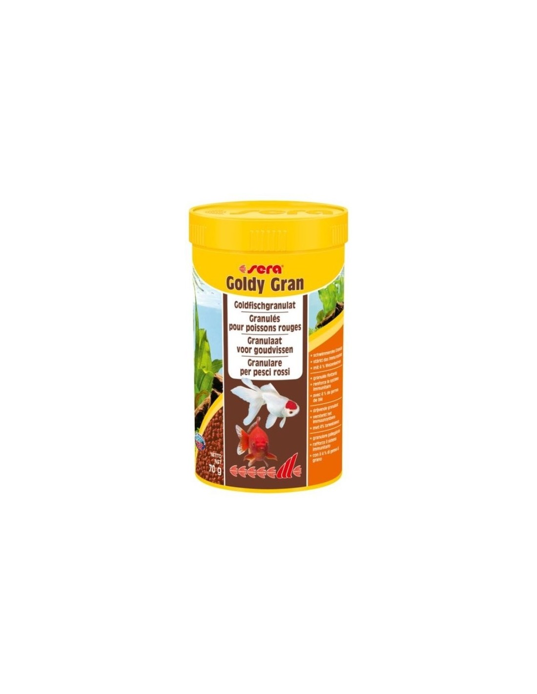 SERA goldy gran è il mangime base completo, in granuli, particolarmente adatto per le varie e preziose forme di allevamento del pesce rosso, molto nutriente e di facile digestione e è quindi ottimale per un allevamento secondo natura di questi animali.