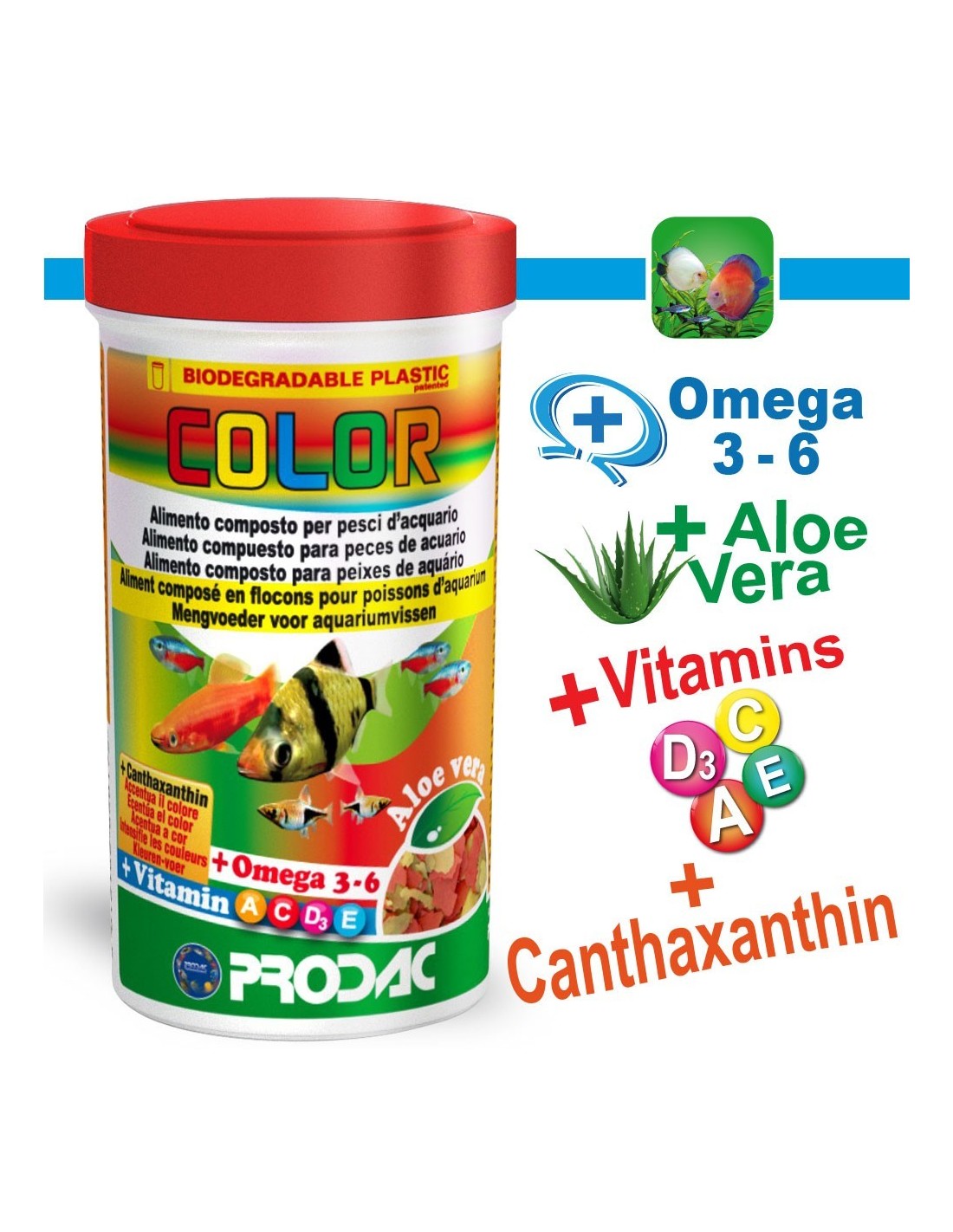 Mangime composto in scaglie per tutti i tipi di pesci tropicali d’acquario d’acqua dolce che accentua il loro colore naturale perché è arricchito con pigmenti come astaxantina e cantaxantina. Ingredienti cereali, pesci e sottoprodotti di pesci, soja, lievito, crostacei, alghe, aloe vera.