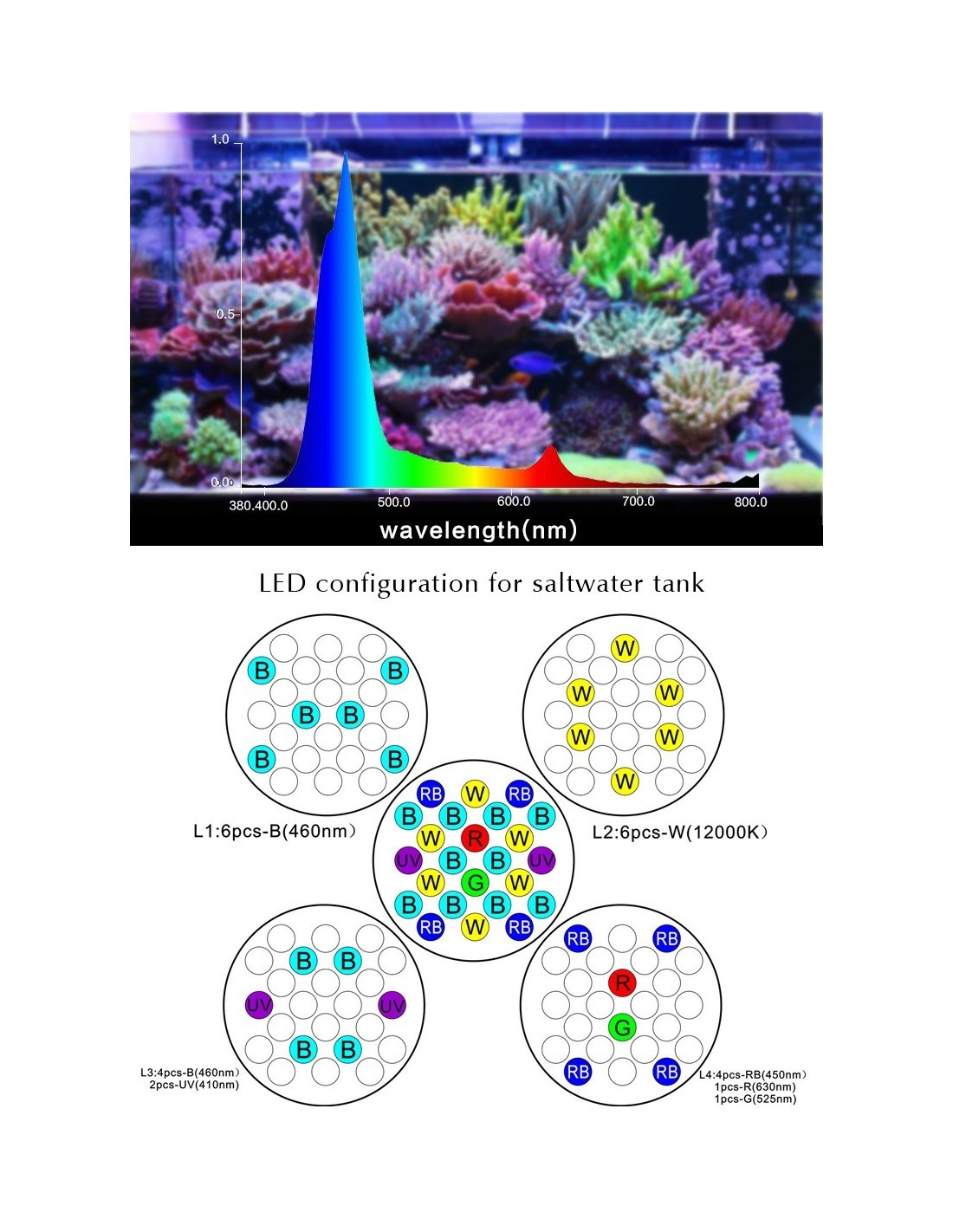 Colori dei Led (programmabile per intensità) : Blù , Blù Royal, Verde, Bianco, Rosso, Giallo.
