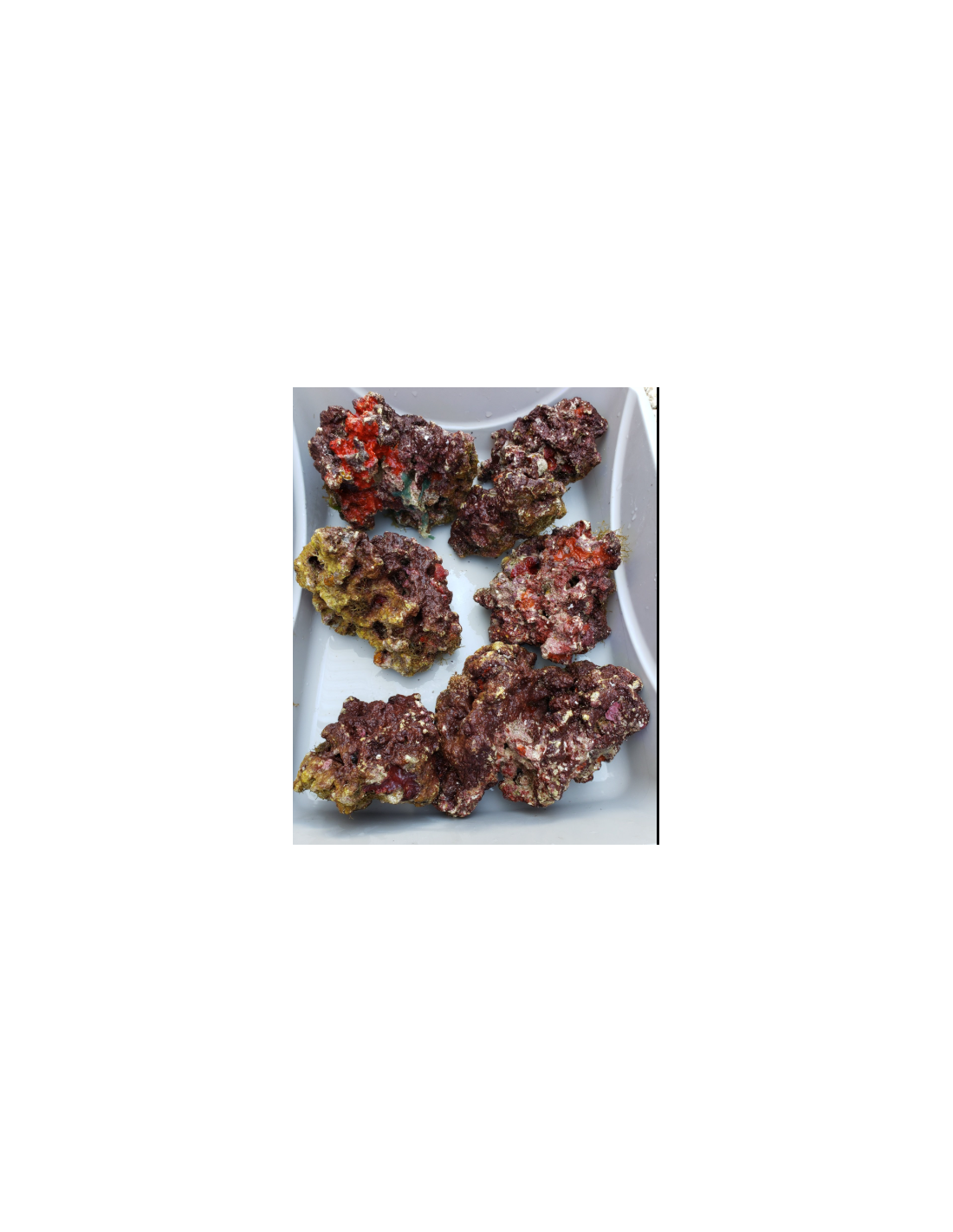 Si tratta di roccia calcarea, prelevata direttamente dal mare, deve essere colonizzata da un'enorme quantità di micro fauna, spesso è incrostata di alghe calcaree e ricca di quei batteri che nell'acquario svolgono il ciclo dell'azoto.