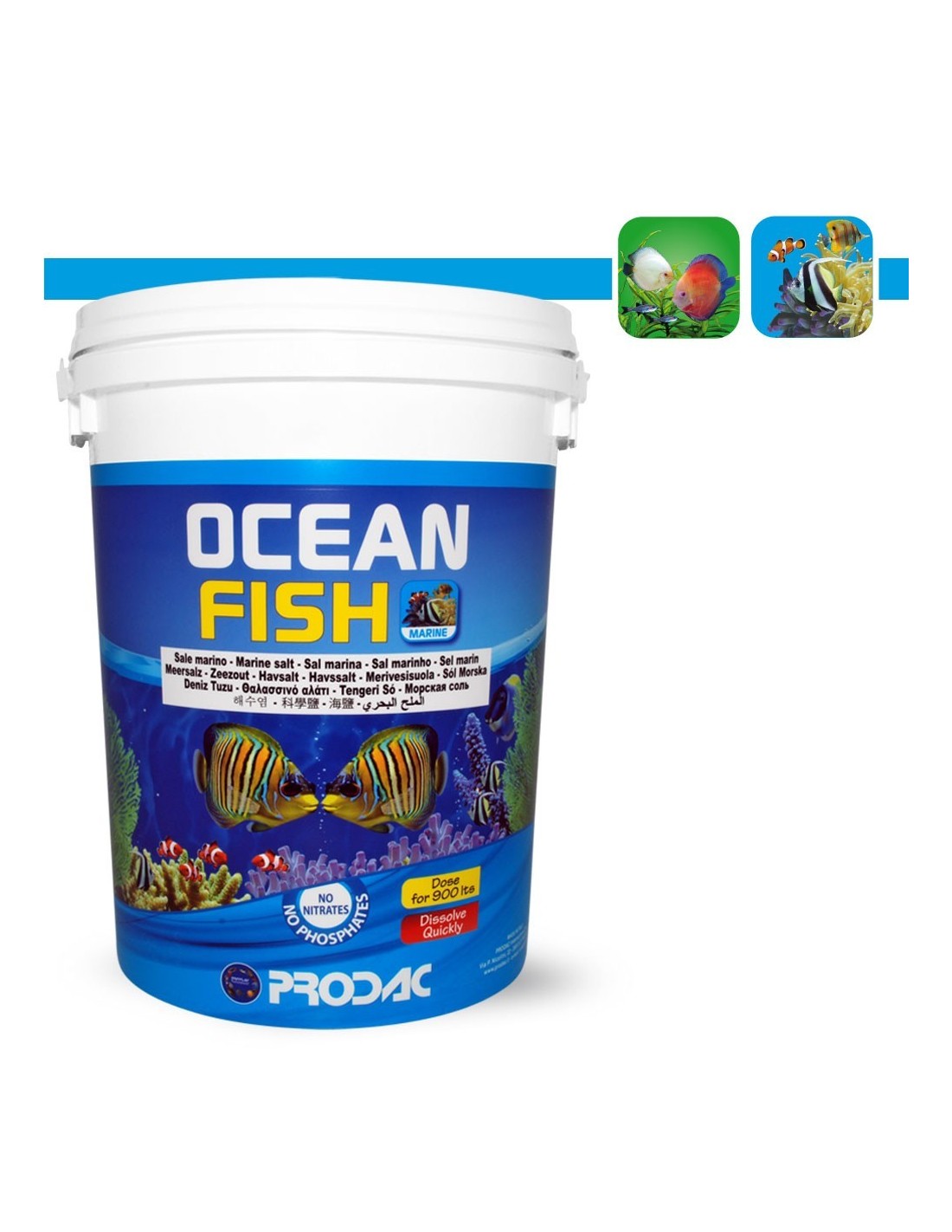 ProdacOCEAN FISH: è un sale marino per acquari ornamentali con un grado di purezza che si avvicina al 100%. Contiene tutti gli oligoelementi necessari allo sviluppo degli organismi animali e mantiene queste sostanze inalterate durante la dissoluzione che è molto veloce. Istruzioni per l’uso: sciogliere in acqua dolce alla temperatura di 24 C° la quantità di sale necessaria nella misura di 33 gr per 1 litro d’acqua, se possibile, è preferibile usare acqua osmotica.