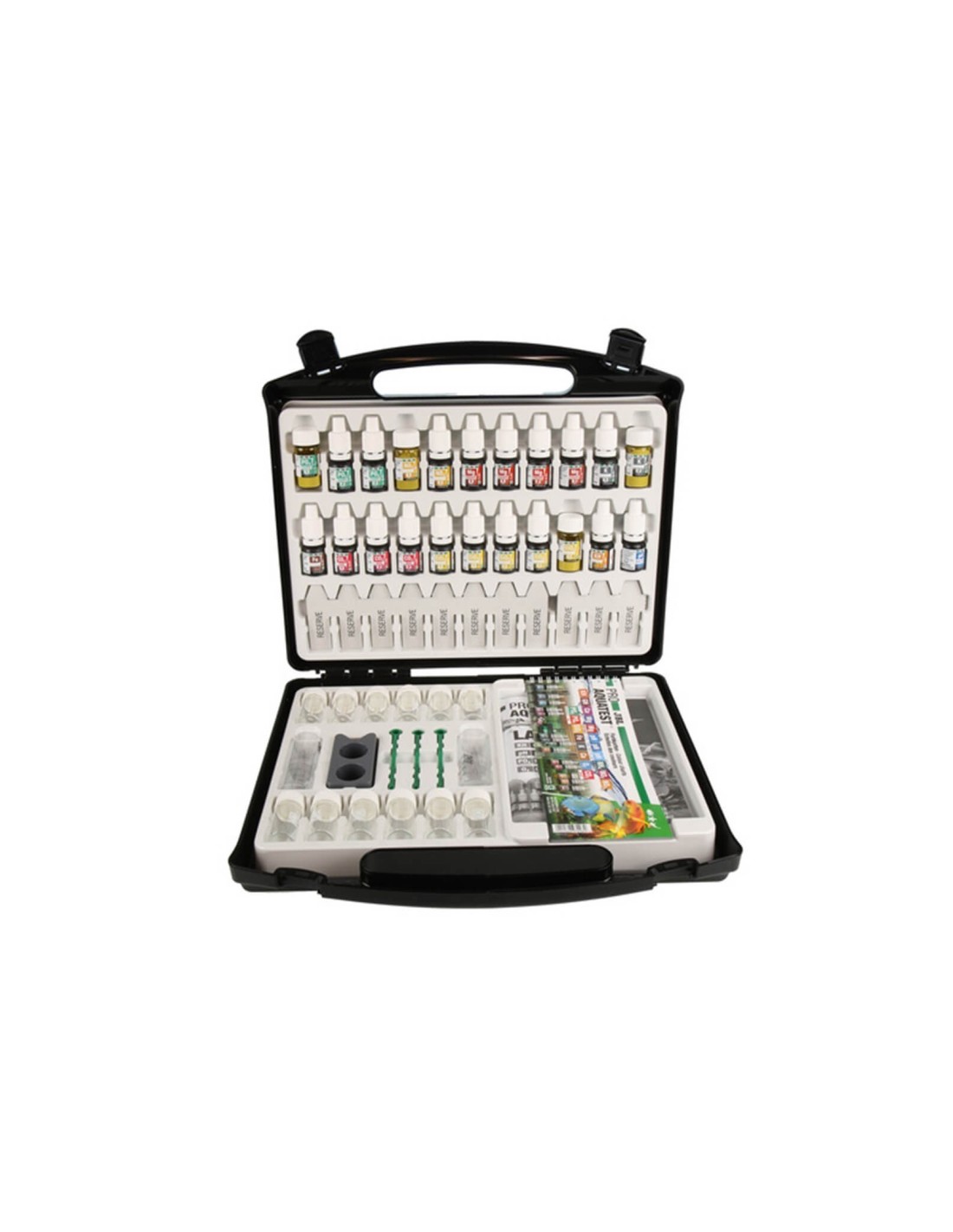 Contiene: 1 valigetta test con 22 reagenti, 12 provette in vetro, 1 provetta speciale per potassio, 2 siringhe, 3 cucchiai dosatori, blocco comparatore, 2 provette in plastica, schede colorimetriche, schede di protocollo, biro, istruzioni per l'uso.